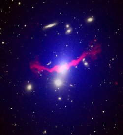 An X-ray image of the elongated cluster of galaxies Abell 2255 taken with the XMM-Newton X-ray observatory by Sakelliou & Ponman shows clear signs that this system is the result of a collision between two progenitor clusters. The X-ray emission from the cluster, shown by the contours on both the images (to the right), is extended east-west, which is evidently the collision axis. Unlike normal clusters, the X-rays do not peak on a bright central galaxy. The temperature of the hot gas responsible for the X-ray emission, shown in the map on the right, reaches 108 K (1 keV is equivalent to 1.16x107 K), and has a complex asymmetrical structure. Cluster collisions such as this are the most energetic events in the Universe since the Big Bang.